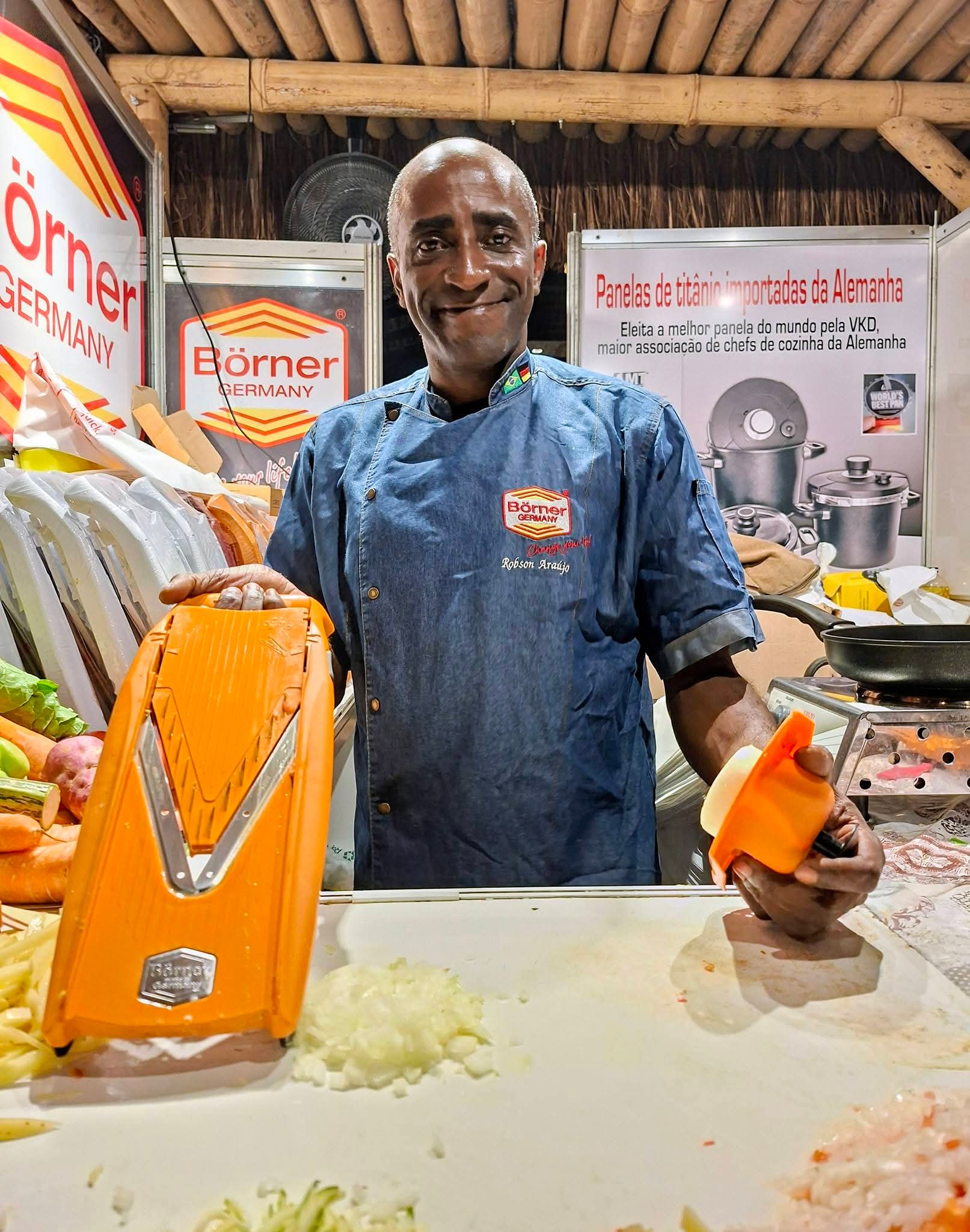 “Trabalhamos exclusivamente com cortadores alemães e panelas de titânio alemãs, produtos exclusivos no Brasil”, explica Robson, com entusiasmo contagiante. E não é para menos. O destaque do estande é considerado o cortador manual mais prático do mundo. Versátil, ele fatia alimentos com espessura que varia de um a quatro milímetros, permitindo preparar desde vinagretes delicadamente picados até cubos perfeitos para sopas e maioneses. Couve, repolho, queijo, salame, presunto — tudo ganha corte preciso, uniforme e rápido.